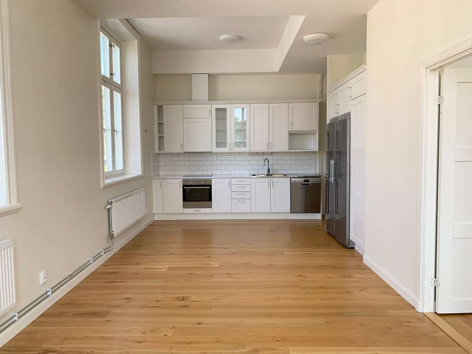 Lägenheten är rymlig och ljus med vitmålade väggar och golv i ekparkett.