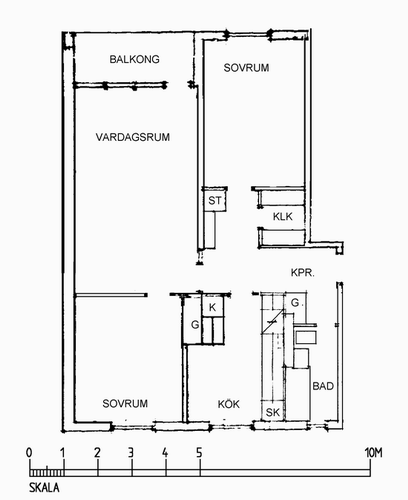 En rymlig bostad med balkong, två sovrum, vardagsrum, kök och ett badrum.