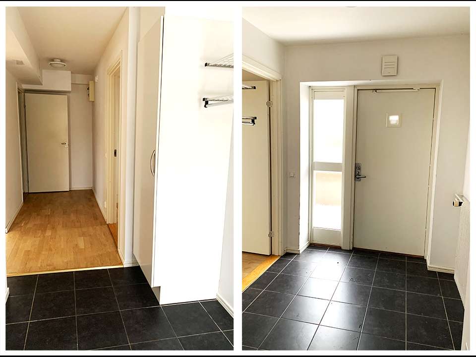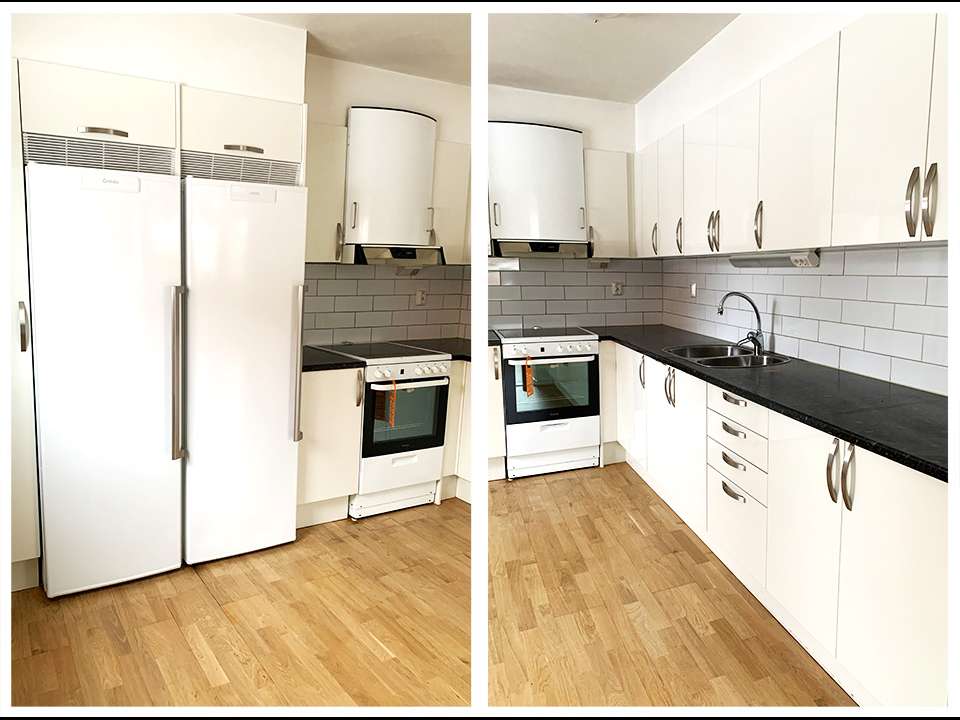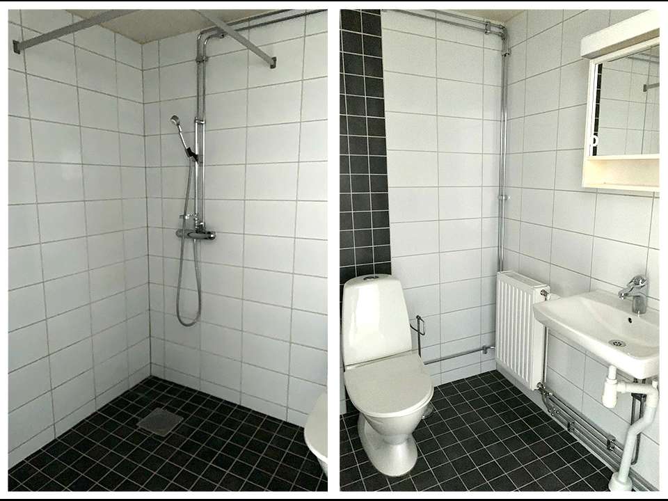Diskmaskin och tvättmaskin går ej att installera och ingen uteplats finns till lägenheten.