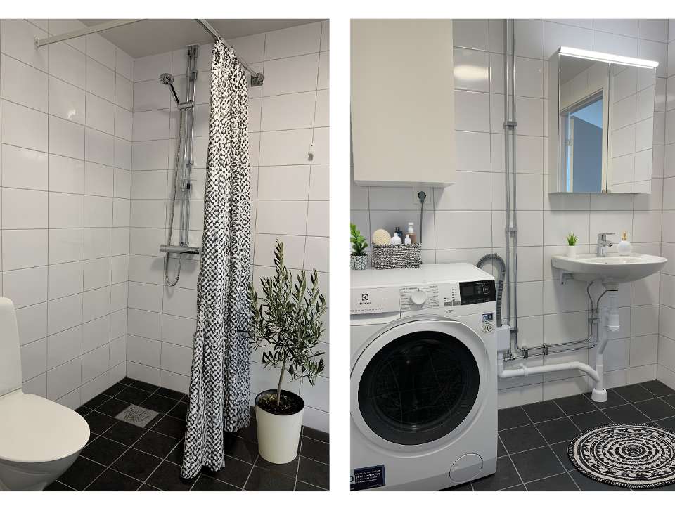 Lägenheten har hög standard ,rymligt badrum med dusch, klinker och kakel, kombimaskin och ett modernt kök med vita luckor. Väggarna är målade i klassiskt vitt och golven är genomgående i ekparkett.