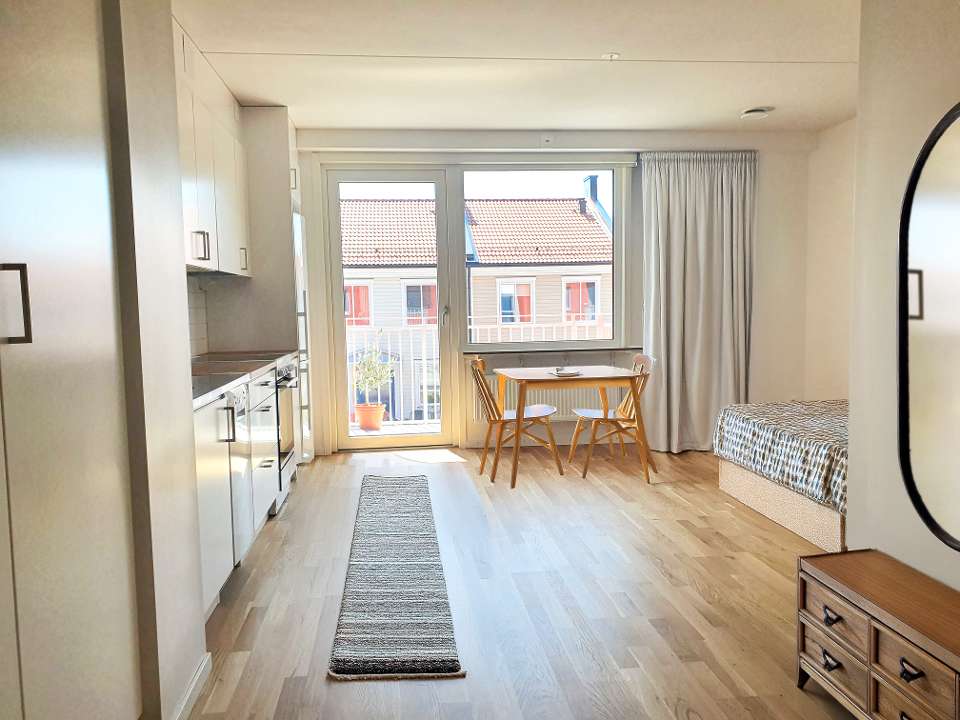 En praktisk och trevlig lägenhet med balkong, ett rum med kök och badrum.