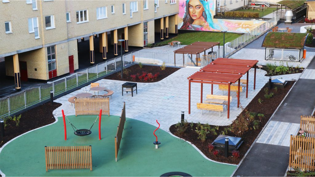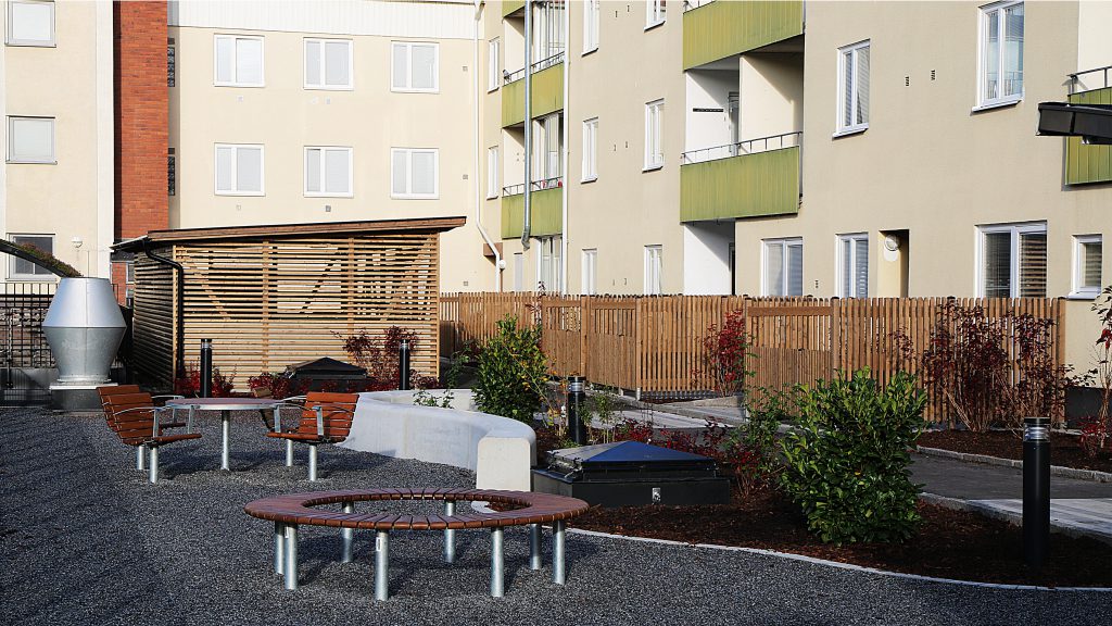 Här finns nu gott om grönska – buskar och blommor som ramar in området och till och med mossa som växer på taken över cykelställen som ger en naturlig, levande känsla. Här hoppas vi att våra hyresgäster i Nyfors ska trivas.